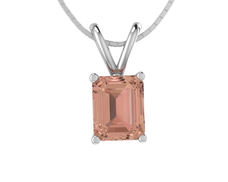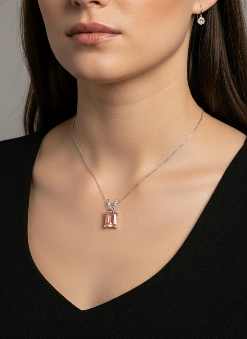 At the center of the pendant sits a stunning 10 × 8 mm emerald-cut lab-created champagne morganite, weighing approximately 4.22 carats. The emerald cut is known for its clean lines and step-cut facets that create a refined hall-of-mirrors effect. This cutting style enhances the gemstone’s clarity while allowing its soft champagne-pink glow to shine beautifully.