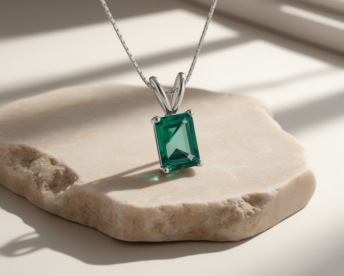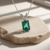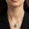 This elegant pendant features an 8 × 10 mm emerald-cut lab-created Colombian emerald (approx. 3.86 ct) set in rhodium-plated 925 sterling silver. Designed with a refined double hook setting, this handcrafted pendant showcases the gemstone’s vivid green color and timeless sophistication, perfect for both everyday elegance and special occasions.
