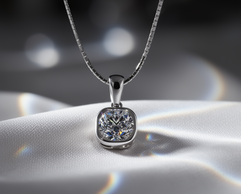 The brilliant stone is set within a cushion-shaped silver frame, adding depth and visual interest to the design. This elegant frame enhances the gemstone’s sparkle while giving the pendant a refined and timeless appearance that complements both modern and classic styles.