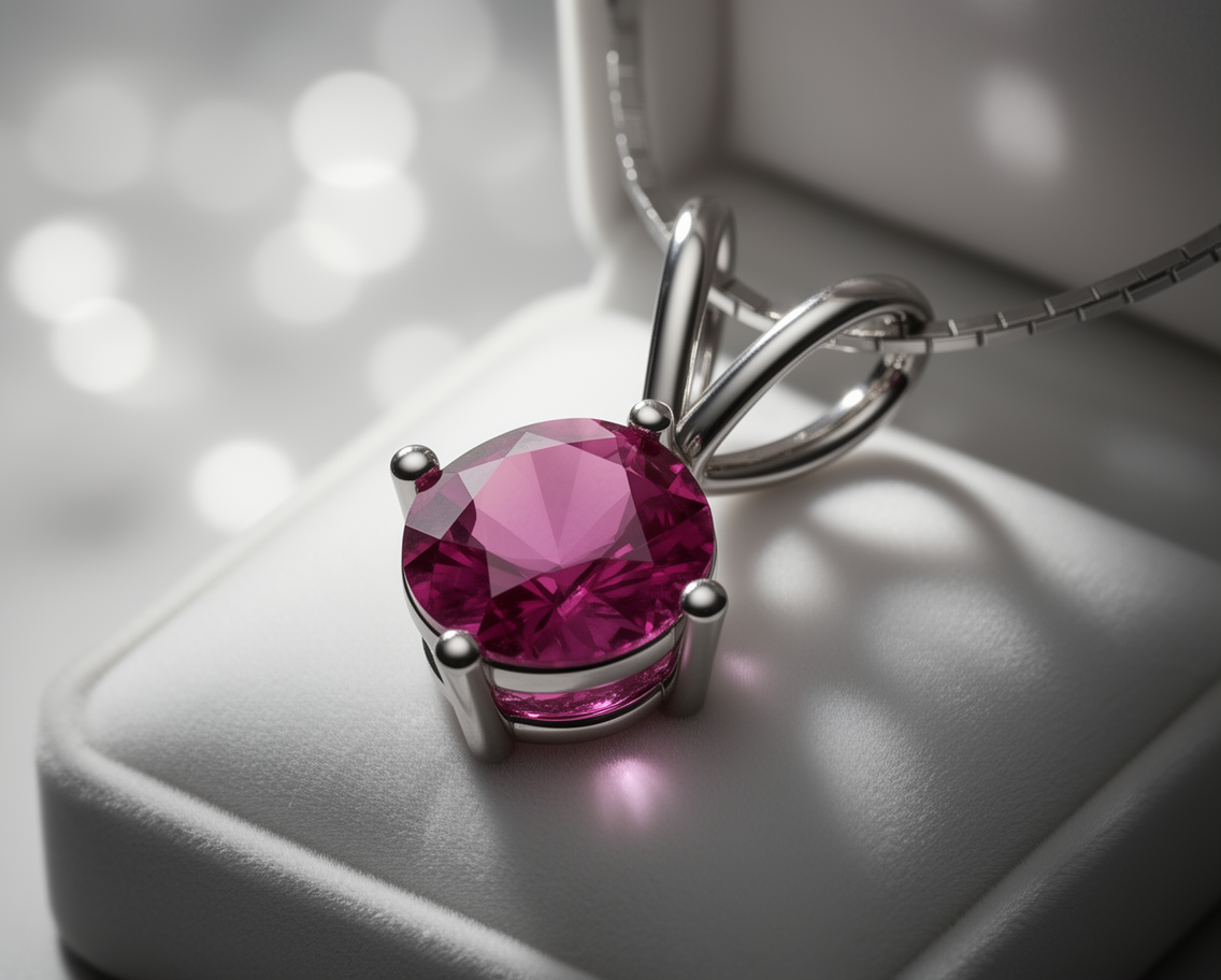 A striking 8mm round dark pink sapphire pendant featuring a double-hook prong setting, handcrafted in rhodium-plated 925 sterling silver. This elegant piece offers brilliant sparkle, vibrant color, and timeless minimalist style.
