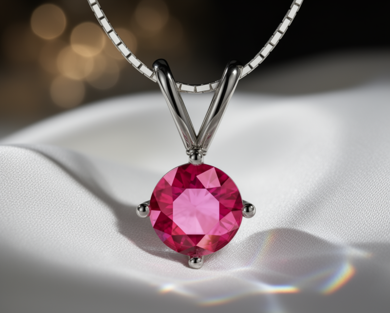 At the center of this pendant lies a brilliant 8mm round lab-created dark pink sapphire, weighing approximately 2.35 carats. The gemstone is expertly precision-cut to maximize brilliance and light reflection, producing a dazzling sparkle that rivals natural gemstones.