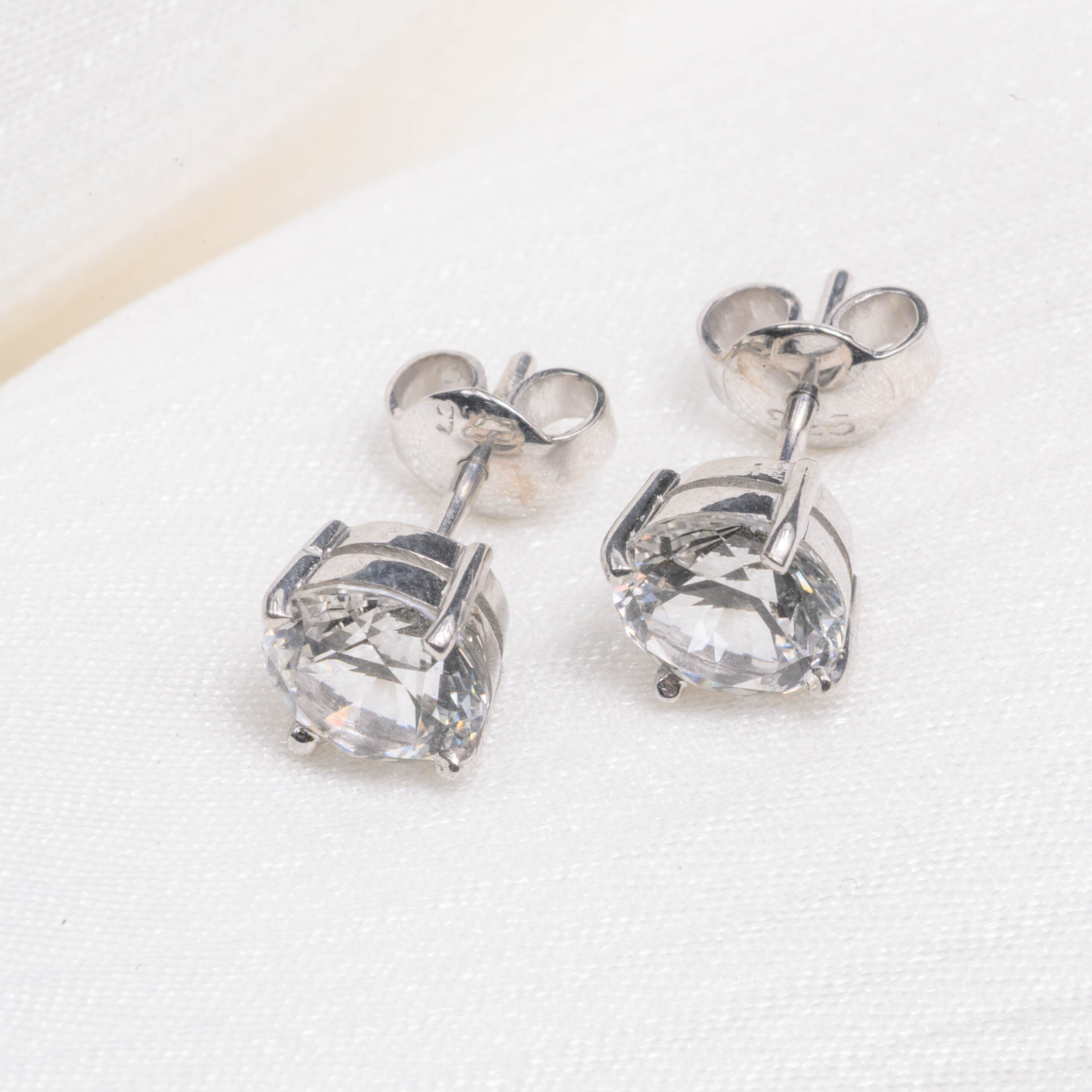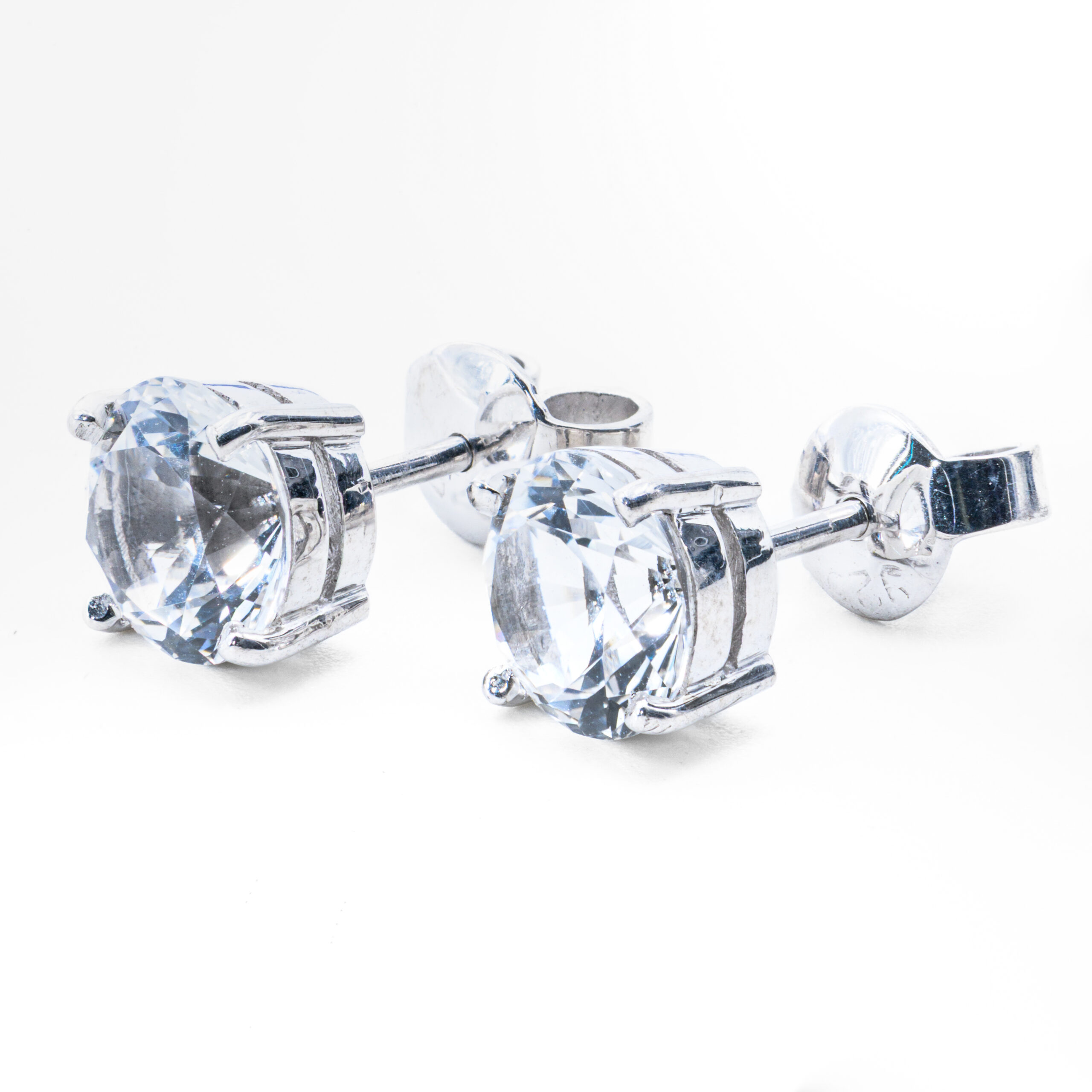 Each earring features a round brilliant-cut White Topaz measuring approximately 7mm, with a combined gemstone weight of about 2.92 carats. Expertly precision-cut, the stones reflect light beautifully, producing exceptional brilliance and fire. Their crystal-clear appearance and radiant sparkle closely resemble the brilliance of diamond earrings.