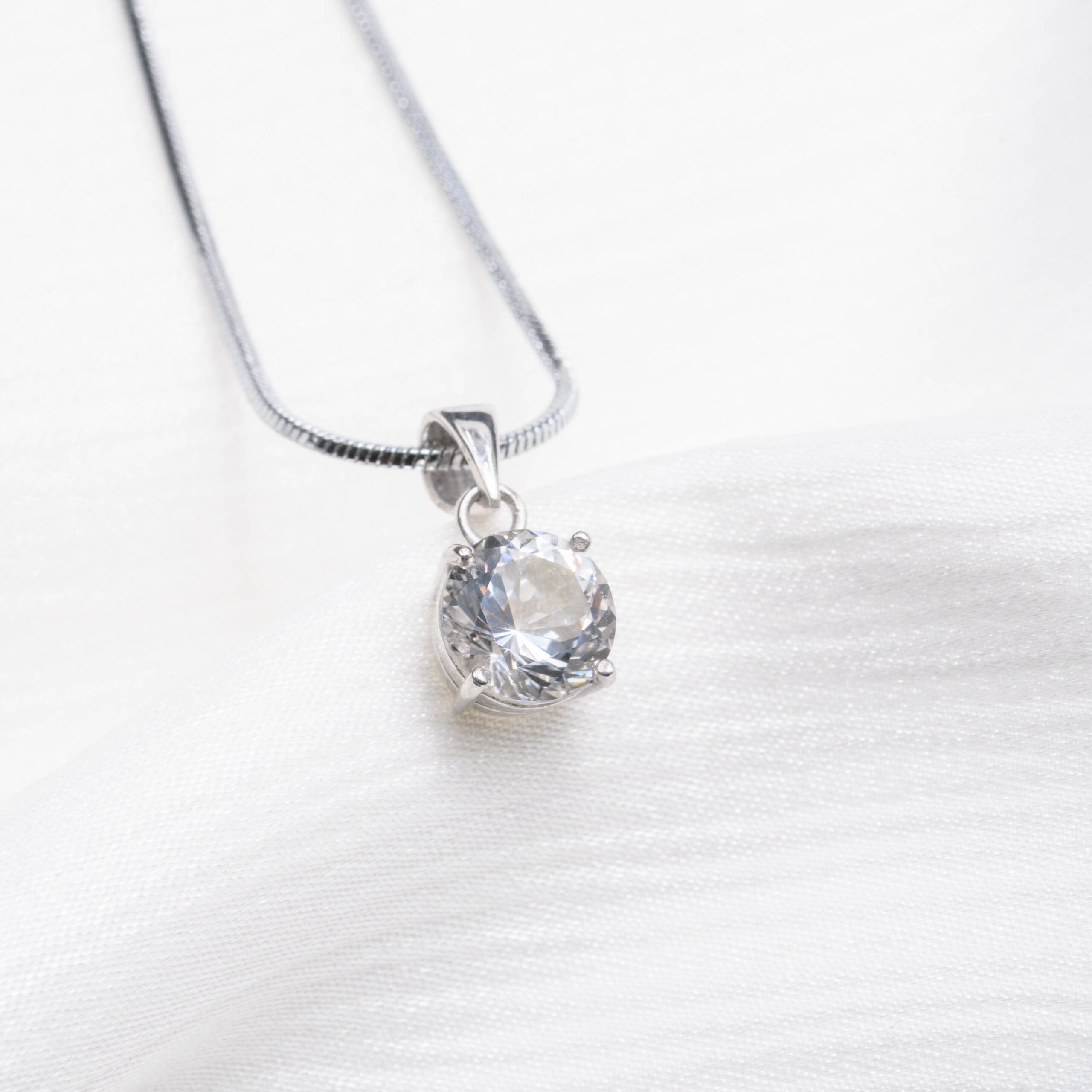 Brilliant and timeless, this pendant features a 2.33 ct round brilliant-cut natural White Topaz (8mm) set in rhodium-plated 925 sterling silver. Precision-cut with extra facets for exceptional sparkle, the gemstone offers stunning diamond-like brilliance in a sleek one-hook design.