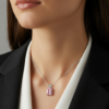 At the center of the pendant sits a beautiful 10 × 8 mm emerald-cut lab-created pink morganite, weighing approximately 2.4 carats. The emerald cut is known for its clean lines and step-cut facets that create a refined “hall-of-mirrors” effect, allowing the gemstone’s soft pink tone to glow with understated brilliance.