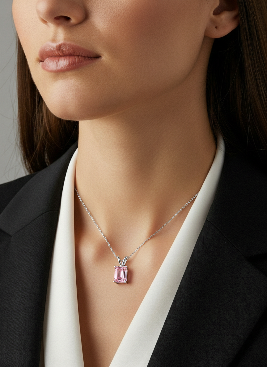 Soft, romantic, and timeless, this Pink Morganite Emerald-Cut Pendant showcases the gentle beauty of one of today’s most admired gemstones. Morganite is celebrated for its delicate blush-pink color and graceful sparkle, making it a favorite among modern jewelry lovers who appreciate feminine elegance and subtle sophistication.