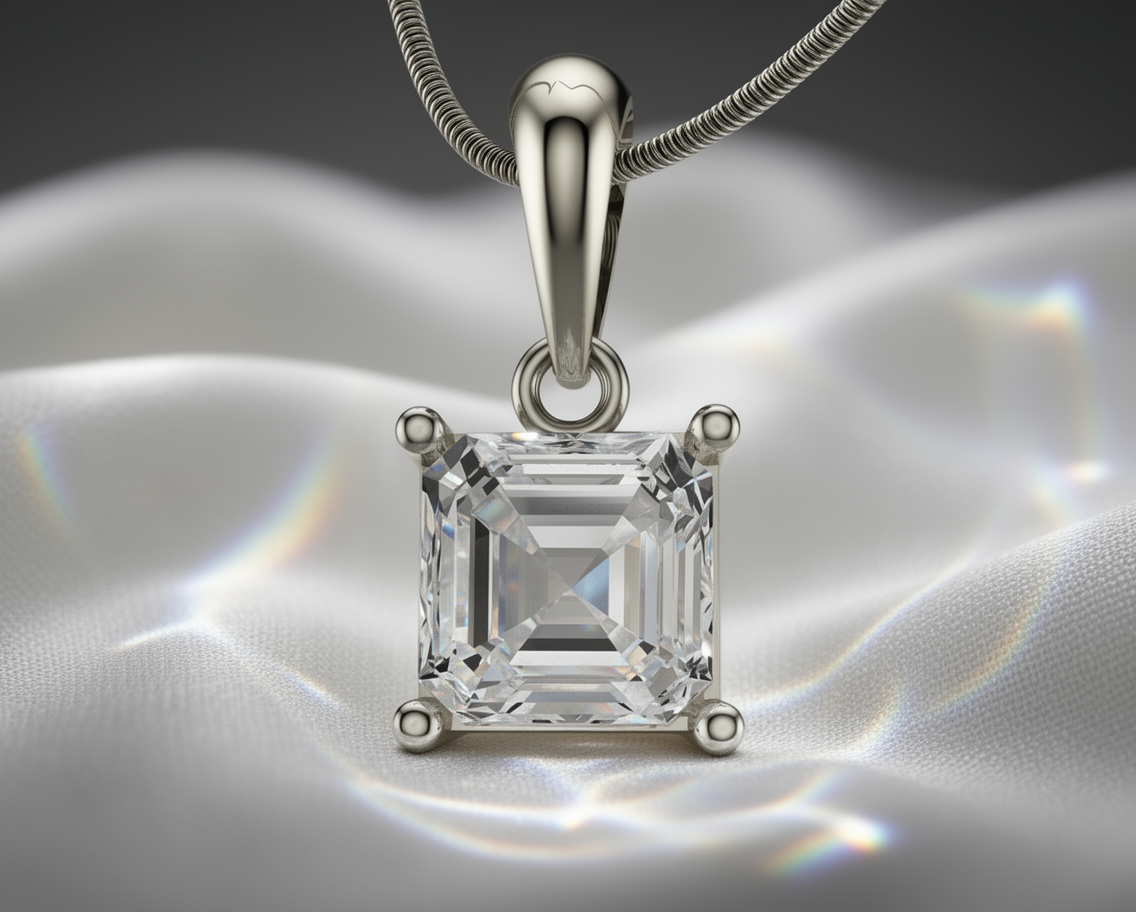 A timeless symbol of elegance, this handcrafted pendant features a 10Ă—10mm Asscher-cut natural White Topaz sourced from Raththota, Sri Lanka, beautifully set in rhodium-plated sterling silver. With its diamond-like brilliance and classic geometric cut, this pendant offers luxurious sparkle and enduring sophistication at an exceptional value.