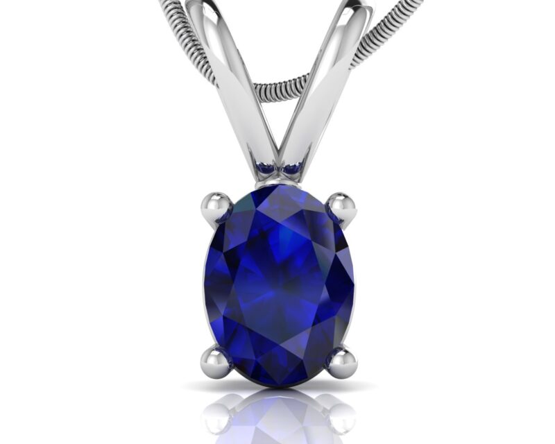 At the center of the pendant is a beautifully faceted 7 × 9 mm oval-cut lab-created blue sapphire, weighing approximately 2.26 carats. The oval cut is known for its elegant shape and ability to enhance the gemstone’s depth of color while providing exceptional brilliance. Its elongated silhouette creates a graceful look that flatters any neckline.