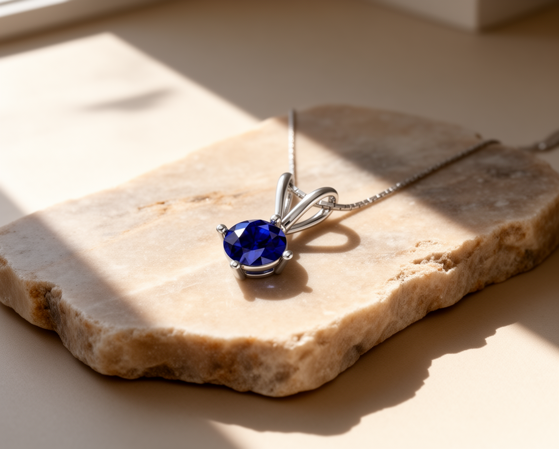The sapphire displays a deep, vibrant royal blue hue, a classic shade admired for its elegance and timeless appeal. This bold yet refined color pairs beautifully with both everyday outfits and formal attire, making the pendant a versatile addition to any jewelry collection.