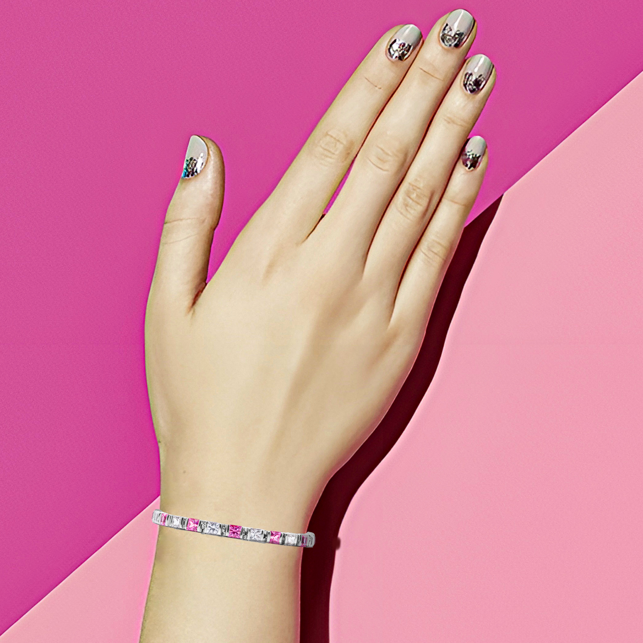 This 8-inch sterling silver tennis bracelet features 23 precision princess-cut sapphires, delivering nearly 30 carats of radiant brilliance in a sleek, structured silhouette.