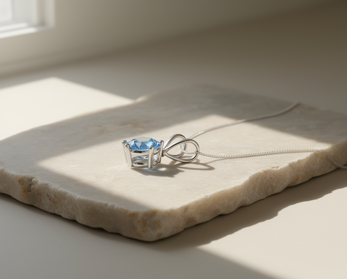 This elegant pendant features an 8 mm round brilliant Swiss blue topaz (approx. 1.99 ct) set in rhodium-plated 925 sterling silver. Designed with a balanced double-hook setting, this handcrafted pendant highlights the gemstone’s vivid ocean-blue color and radiant brilliance, creating a timeless piece perfect for both everyday wear and special occasions.