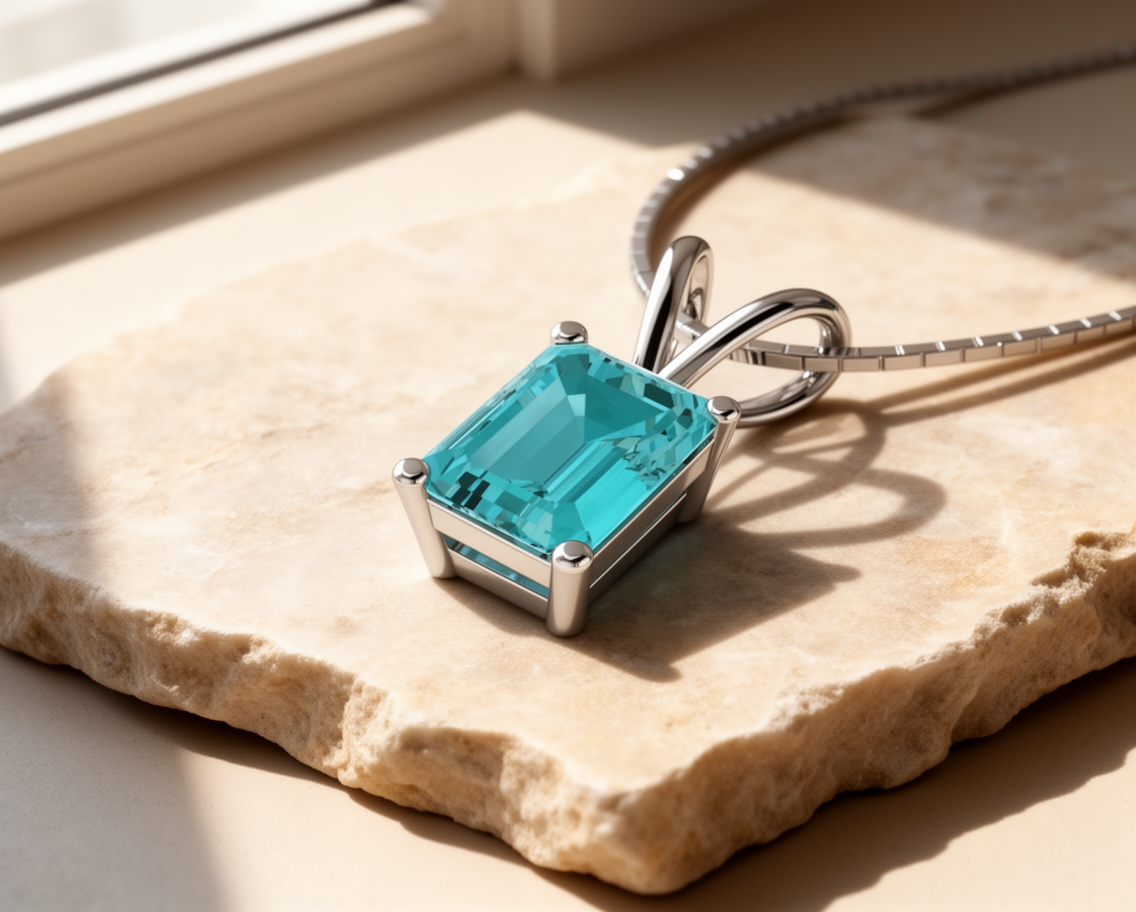Striking and vibrant, this pendant features a 4.17 ct emerald-cut Paraiba tourmaline (7×9mm) set in rhodium-plated 925 sterling silver. The elegant two-hook design highlights the gemstone’s rare blue-green brilliance and timeless sophistication.